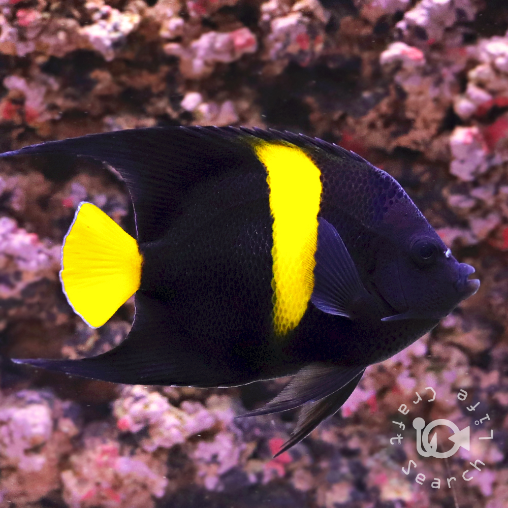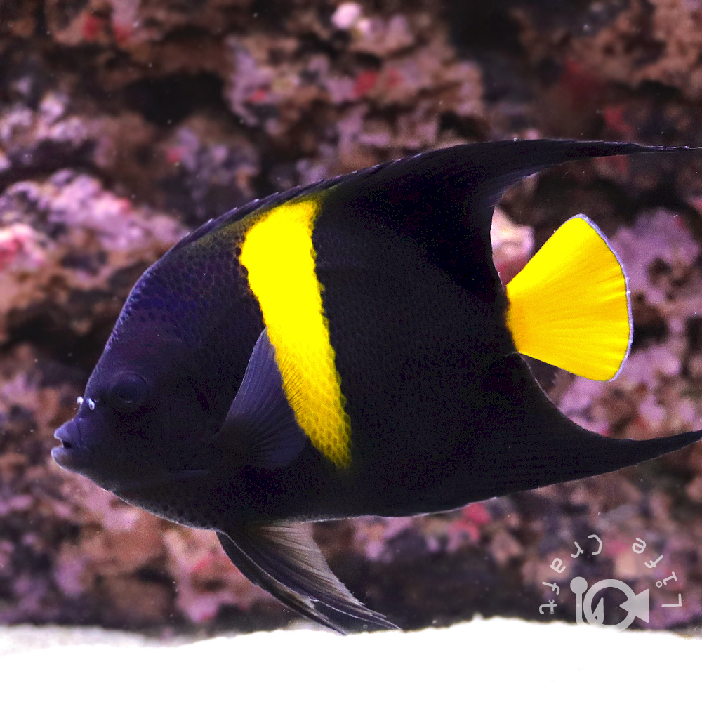 | タテジマキンチャクダイを代表とする大型ヤッコ『Pomacanthus属』の仲間で、これに属する幼魚たちはどれも非常に似ていて、黒を基調として白と青の模様が入ります。 アズファーエンゼルの幼魚は尾部と背中から腹部にかけて黄色が発現する点で判別できます。 近縁種のマクロスエンゼルに似ていますが、本種の体色は濃紺で腹部の三日月模様は背ビレの末端まで伸びず体色との境界がはっきりしています。 飼育自体は容易で初めから人工エサを食べる個体も多く、餌付いていない場合でも冷凍のブラインシュリンプやホワイトシュリンプを与えれば徐々に粒エサを食べ始めます。 |
