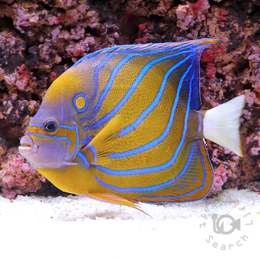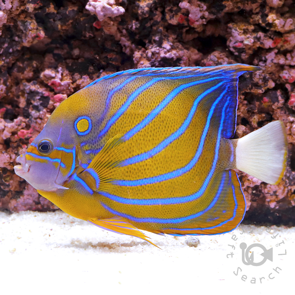 | タテジマキンチャクダイを代表とする大型ヤッコ『Pomacanthus属』の仲間で、これに属する幼魚たちはどれも非常に似ていて、黒を基調として白と青の模様が入ります。 ワヌケヤッコの幼魚は白い帯が細めで、背ビレと尻ビレの末端に近づくに連れてその帯が一部リング状になる点で判別できます。特に似ている幼魚にアデヤッコがいますが、ワヌケヤッコの方が体高があります。 大型ヤッコの中でも特に大きくなる種類で、成魚では斜めに入るブルーのラインが特徴的で水槽の主役的な存在感を持つ魚です。 やや神経質な面もありますが、人工エサに餌付いていない場合は落ち着いた環境下で冷凍のブラインシュリンプやホワイトシュリンプを与えれば徐々に粒エサを食べ始めます。 |