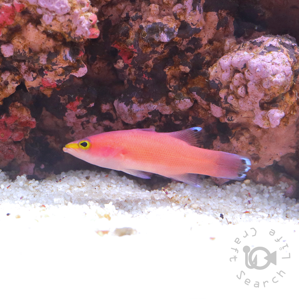 | ケーブバスレットはカリブ海の水深25〜100mほどの深場にある洞窟や岩壁に生息する小型バスレットの仲間です。 レッド〜ピンクの体に、唇の上に入るイエローがとても可愛く印象的。 やや臆病な面があるため、大光量のサンゴ水槽での飼育は避けて岩組を多く用意し、同種との混泳を避けることが推奨されます。 流通は稀で上級者向けとされることもありますが、肉食性が強いのでまずは冷凍飼料から慣らし、落ち着いた環境を整えることで飼育は容易になります。 |