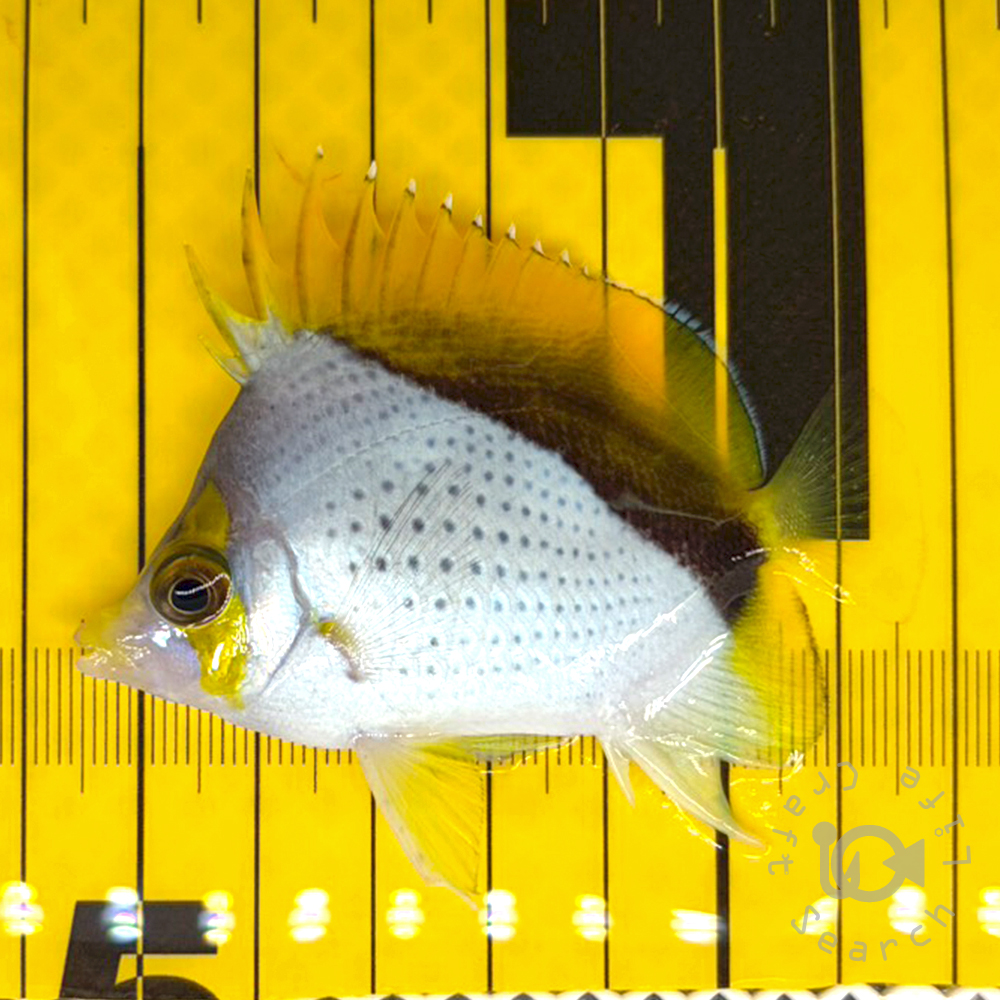 | マルケサスバタフライは中部太平洋のマルケサス諸島やライン諸島などに生息するチョウチョウウオの仲間です。 銀白色の体に黒い斑点、目を通るバンドと背ビレのひときわ映えるイエローが美しい種類。 野生下では岩礁や砂地の海底に生息し、サンゴポリプや甲殻類、藻類を食べています。 サンゴや無脊椎動物をつつく可能性があるため、リーフタンクでは注意が必要。 飼育には中級者以上の経験がほしいところですが、その美しい外見から非常に高い人気があります。 |