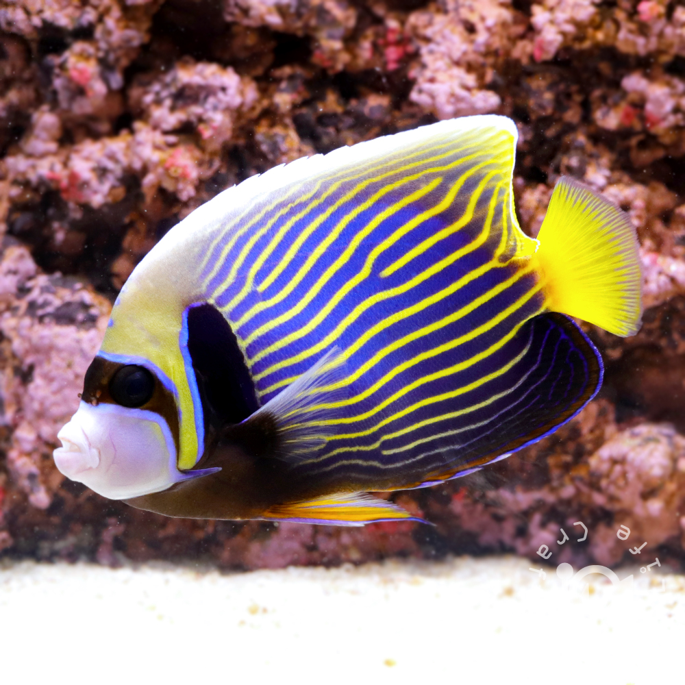 | 大型ヤッコ『Pomacanthus属』の仲間で、これに属する幼魚たちはどれも非常に似ていて、黒を基調として白と青の模様が入ります。 タテジマキンチャクダイの幼魚は別名『ウズマキ』とも呼ばれ、Pomacanthus属の中では判別が非常に容易で名前の通りウズマキ状の模様をしています。 この模様は成長につれて変化していき、半成魚が通称『ウズキン』として流通することもあります。 インドネシア産(太平洋型)の成魚は背ビレの末端が伸びるのが特徴ですが、インドネシアは太平洋とインド洋に囲まれているため、一部インド洋型が混じることもあり完全に成長し切るまで判別は困難。 飼育自体は容易で初めから人工エサを食べる個体も多く、餌付いていない場合でも冷凍のブラインシュリンプやホワイトシュリンプを与えれば徐々に粒エサを食べ始めます。 |