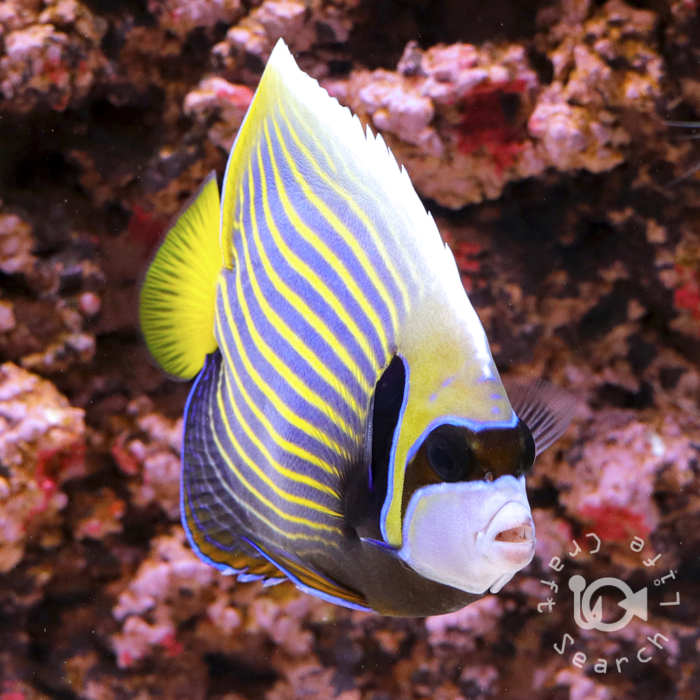 | 大型ヤッコ『Pomacanthus属』の仲間で、これに属する幼魚たちはどれも非常に似ていて、黒を基調として白と青の模様が入ります。 タテジマキンチャクダイの幼魚は別名『ウズマキ』とも呼ばれ、Pomacanthus属の中では判別が非常に容易で名前の通りウズマキ状の模様をしています。 この模様は成長につれて変化していき、半成魚が通称『ウズキン』として流通することもあります。 インドネシア産(太平洋型)の成魚は背ビレの末端が伸びるのが特徴ですが、インドネシアは太平洋とインド洋に囲まれているため、一部インド洋型が混じることもあり完全に成長し切るまで判別は困難。 飼育自体は容易で初めから人工エサを食べる個体も多く、餌付いていない場合でも冷凍のブラインシュリンプやホワイトシュリンプを与えれば徐々に粒エサを食べ始めます。 |