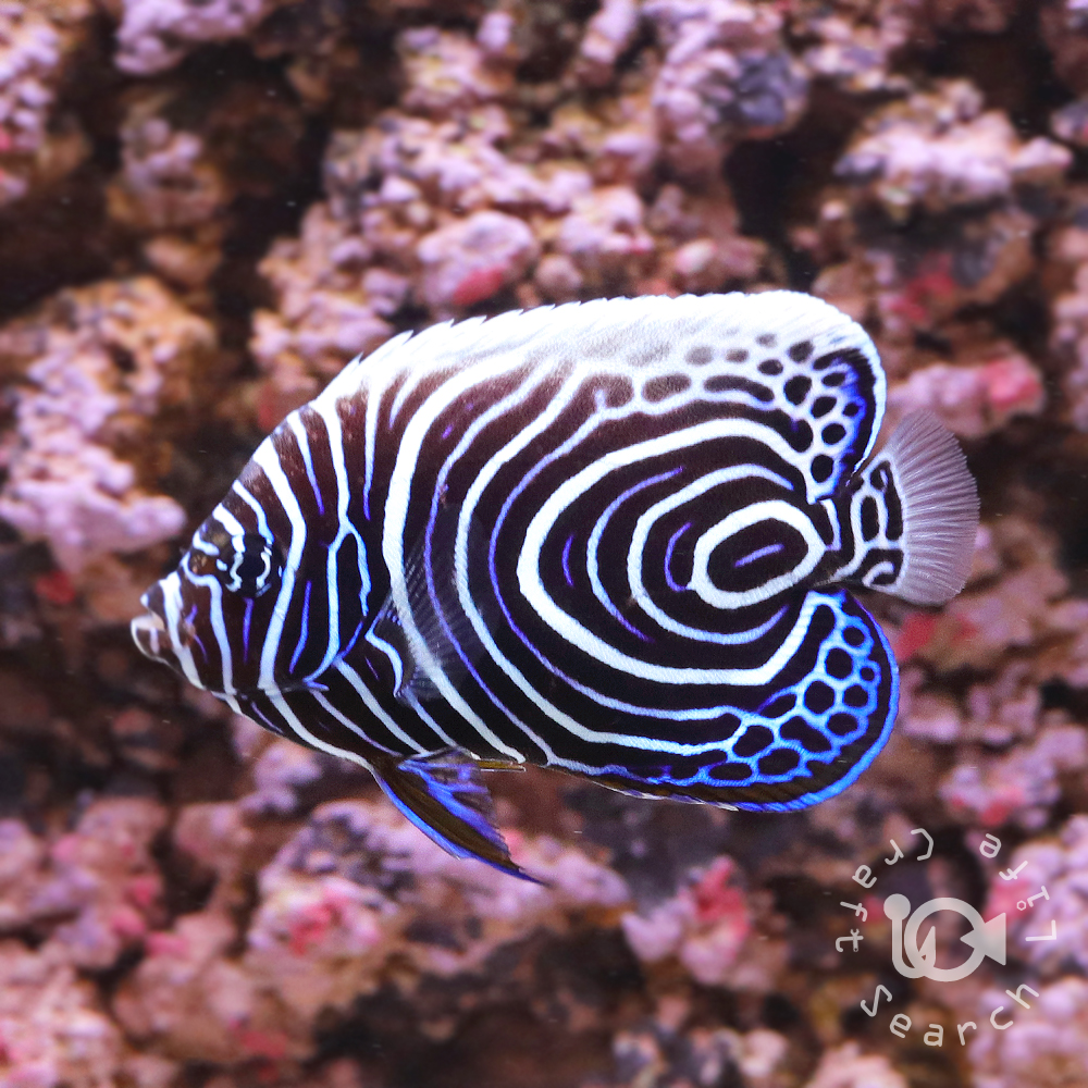 | 大型ヤッコ『Pomacanthus属』の仲間で、これに属する幼魚たちはどれも非常に似ていて、黒を基調として白と青の模様が入ります。 タテジマキンチャクダイの幼魚は別名『ウズマキ』とも呼ばれ、Pomacanthus属の中では判別が非常に容易で名前の通りウズマキ状の模様をしています。 この模様は成長につれて変化していき、半成魚が通称『ウズキン』として流通することもあります。 スリランカ産(インド洋型)の成魚は背ビレの末端が丸くなるのが特徴。 飼育自体は容易で初めから人工エサを食べる個体も多く、餌付いていない場合でも冷凍のブラインシュリンプやホワイトシュリンプを与えれば徐々に粒エサを食べ始めます。 |
