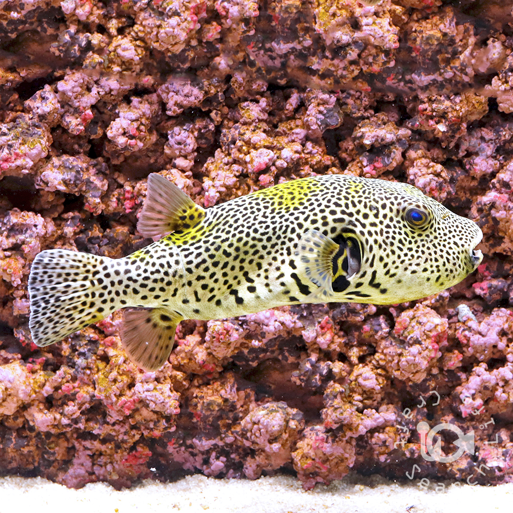 | モヨウフグはインド洋から西部太平洋のサンゴ礁や砂地に広く分布する大型のフグの仲間です 。 白から灰色地の体には黒点が散在し、幼魚は鮮やかな黄色地に黒模様が入ることからゴールデンステラートパファーとも呼ばれます。 性質は穏やかですが、サンゴや甲殻類を食べる傾向があり無脊椎動物全般との混泳は避けた方が無難 。 野生下ではサンゴや海綿、軟体動物など、動物性のエサを好んで捕食します。 水槽飼育下でもクリルなど動物質系の飼料を与え、個体差はありますが徐々に人工飼料にも興味を持たせると飼育が楽になります。 皮膚にテトロドトキシンという毒を持っていて、大型になることから90cm以上の水槽での単独飼育が理想ですが、フグ独特の愛嬌からペット感覚で飼育できる1匹です。 |