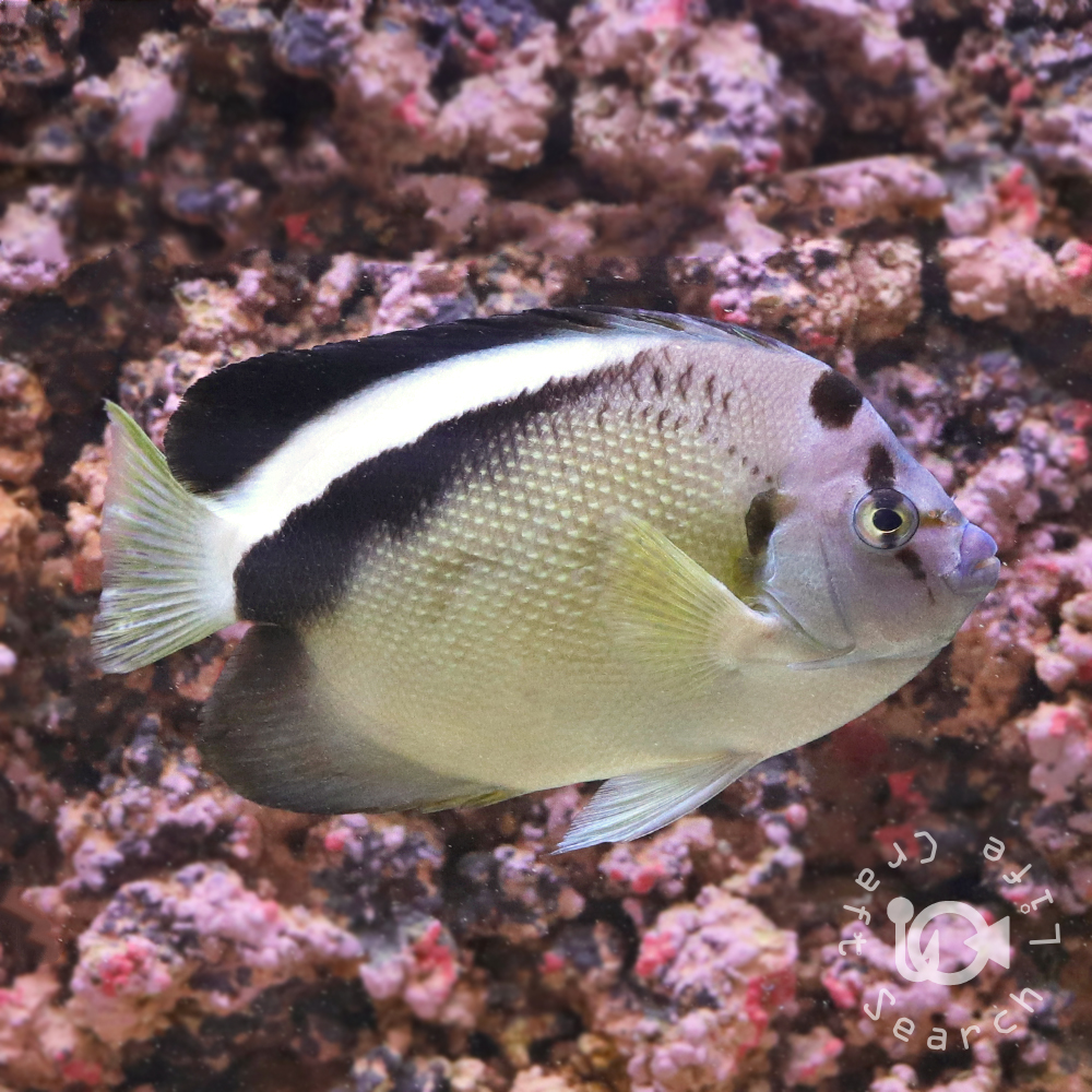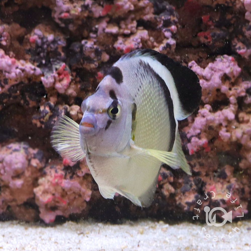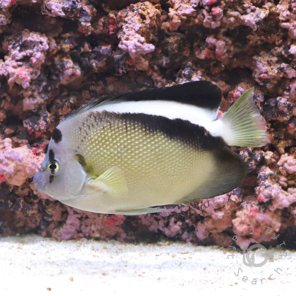 | グリフィスエンゼルは太平洋の水深30〜60mに生息し、黒と白の鮮明な模様が美しいヤッコの仲間です。 特に目を引くのは目の上から下へ流れる黒いストライプで、水槽内に優雅で洗練されたシックな印象を与えます。 飼育難易度はやや高めですが、入荷量の少なさからくるその希少性と独特な美しさでマニアの人気を集めています。 |