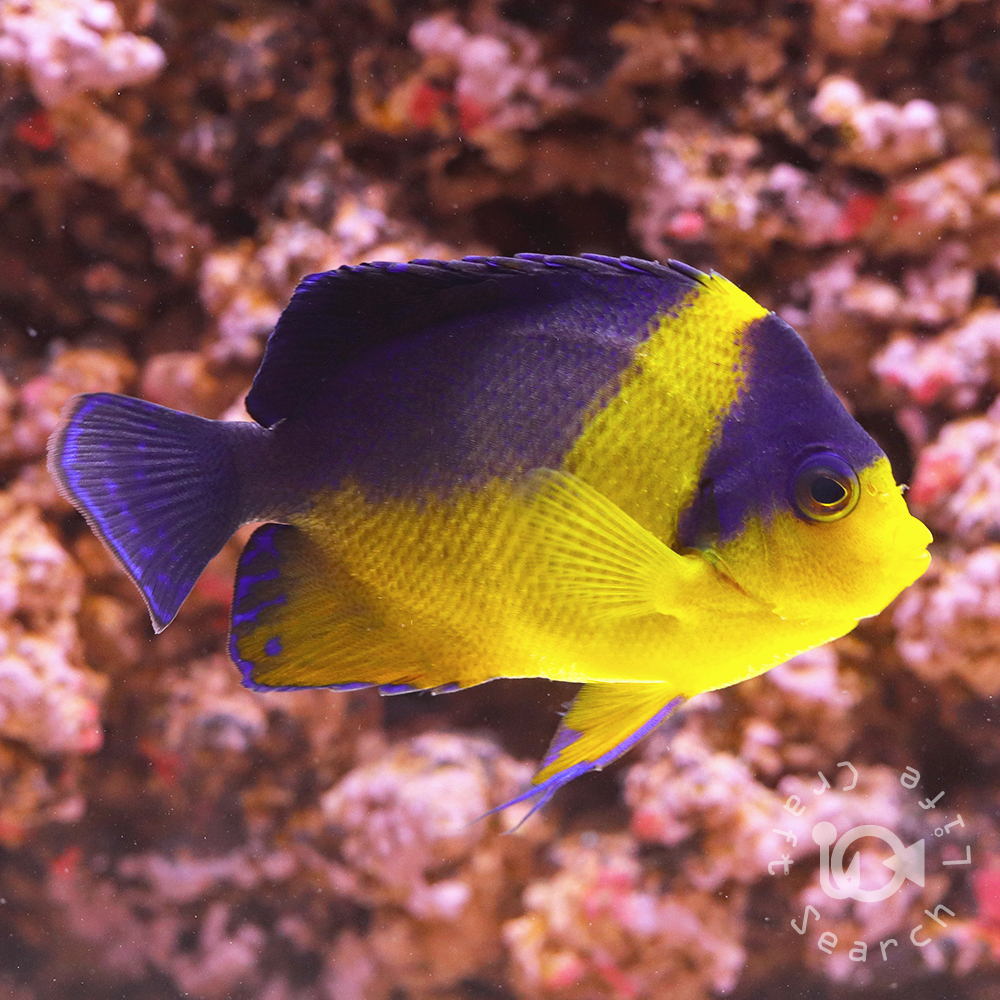 | スミレヤッコは西部太平洋(南日本〜北フィリピン)の岩礁斜面や洞窟などがある水深約10〜40mに生息する小型ヤッコの仲間です。 背中と目元に入る濃いブルーと腹部から伸びる爽やかなイエローが魅力的な非常に人気の高い種類。 臆病な性格ですが飼育環境に慣れるとヤッコ特有の縄張り意識も強く出るので、同種同士の混泳は避けた方が無難です。 野生下では藻類や海綿などを食べていますが、水槽飼育下ではシマヤッコに並んで餌付きにくいことで有名で、アサリや冷凍飼料を用いて落ち着いた環境を用意することが飼育成功のカギと言えます。 |
