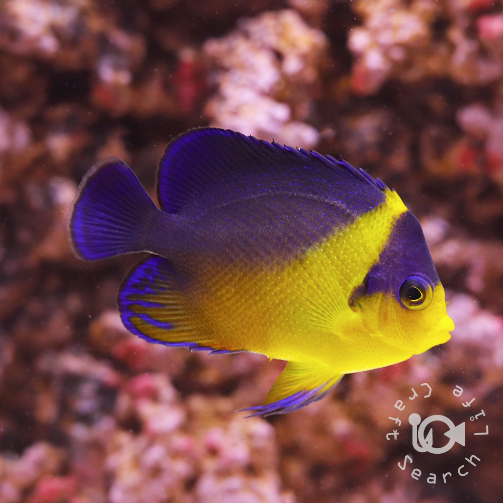 | スミレヤッコは西部太平洋(南日本〜北フィリピン)の岩礁斜面や洞窟などがある水深約10〜40mに生息する小型ヤッコの仲間です。 背中と目元に入る濃いブルーと腹部から伸びる爽やかなイエローが魅力的な非常に人気の高い種類。 臆病な性格ですが飼育環境に慣れるとヤッコ特有の縄張り意識も強く出るので、同種同士の混泳は避けた方が無難です。 野生下では藻類や海綿などを食べていますが、水槽飼育下ではシマヤッコに並んで餌付きにくいことで有名で、アサリや冷凍飼料を用いて落ち着いた環境を用意することが飼育成功のカギと言えます。 |