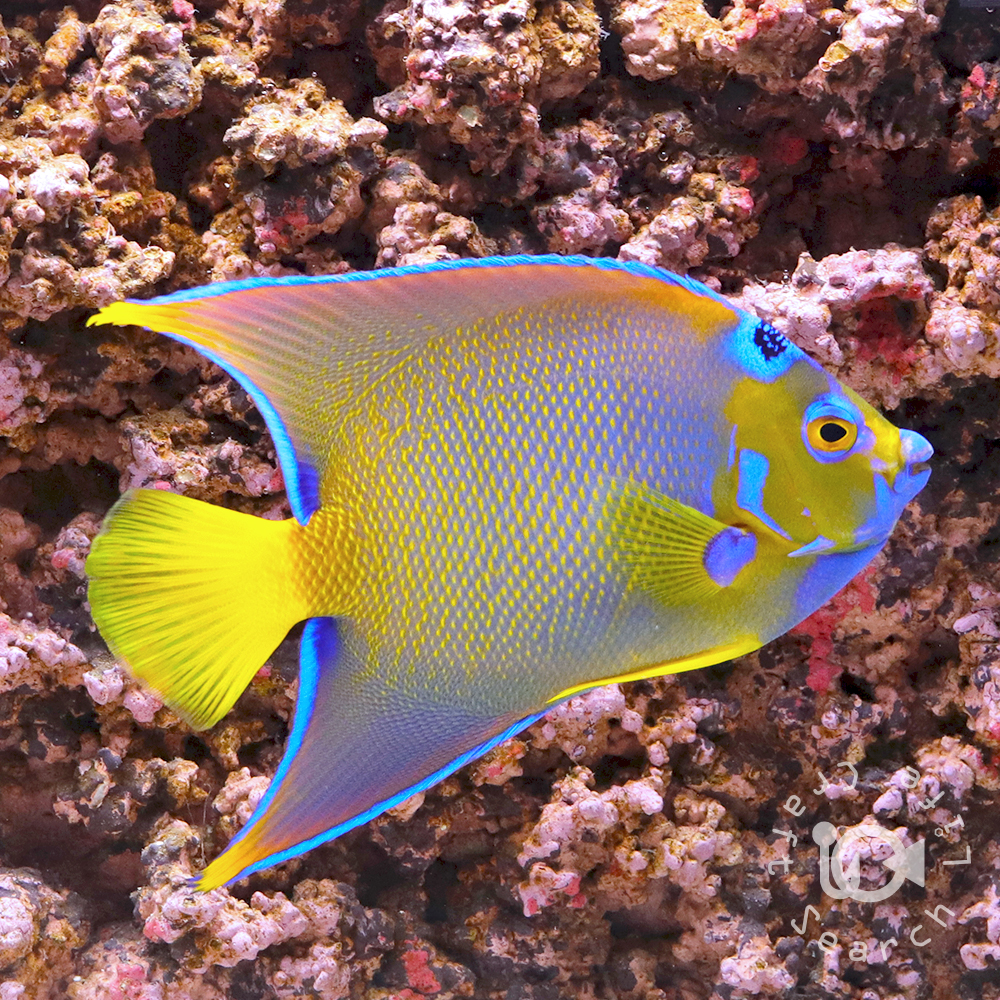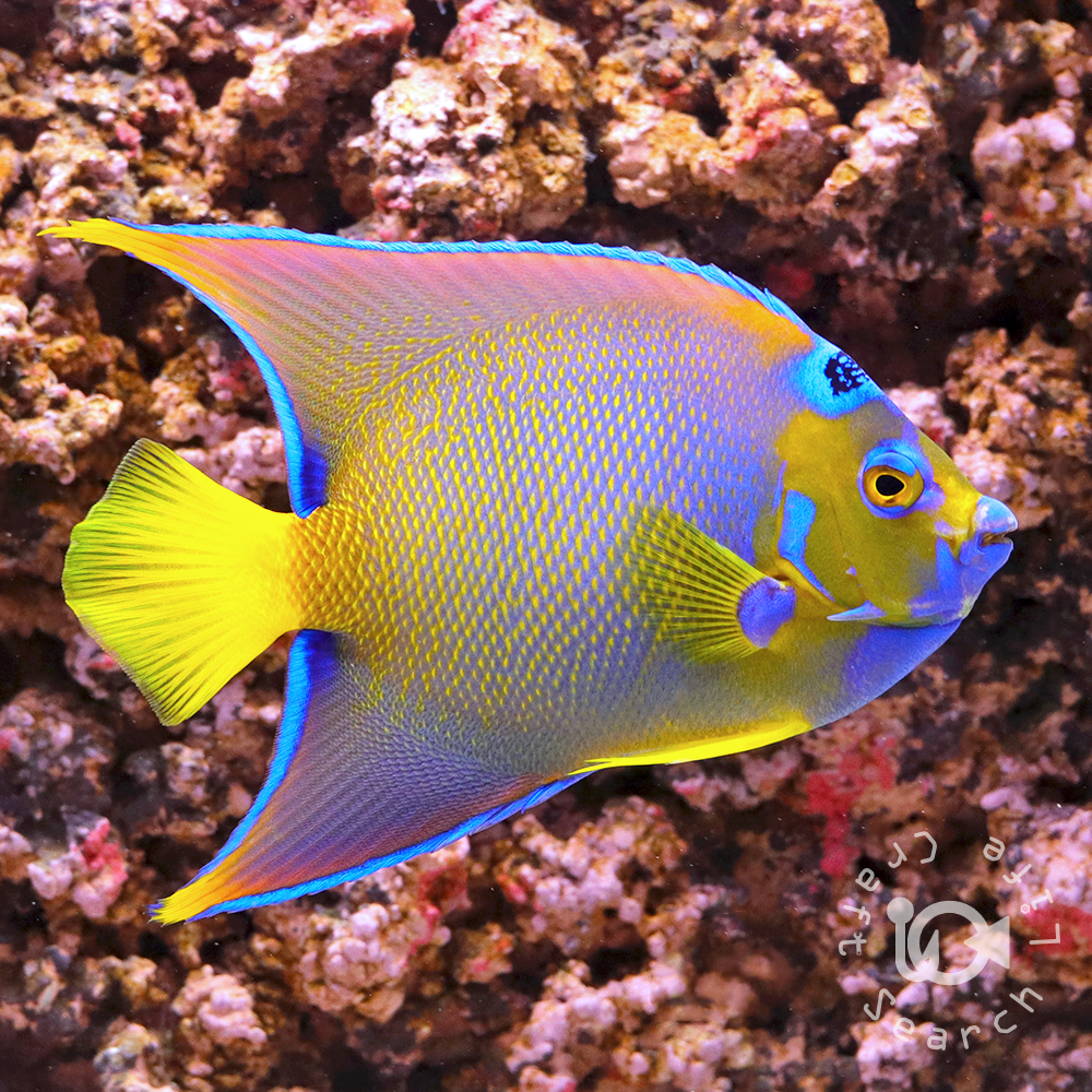 | 大西洋に住む大型ヤッコで似た種類にブルーエンゼルがいますが、本種の成魚は尾ビレ完全に黄色く、スレッドにオレンジ色が入る点で区別できます。 同種間で多少争うことがあり大型水槽でも混泳には注意が必要。 クイーンエンゼルの特徴でもある長いスレッドを美しく成長させるためには、混泳相手に気を付け、幅・高さ共に広々とした水槽で飼育することが理想です。 |